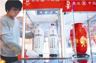 近日,記者在中山書城一樓看到一種帶“奧運(yùn)會(huì)徽”“福娃”圖案的陶瓷制品在中山上市。據(jù)了解,這種瓷瓶是為迎接2008年在北京舉行的第29屆奧運(yùn)會(huì),經(jīng)北京奧組委授權(quán)發(fā)行的,屬于限量發(fā)行的收藏品,有很高的藝術(shù)價(jià)值和收藏價(jià)值。