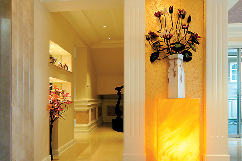一層客廳是斜頂,因此,吊頂不做過多的裝飾,只是把客廳墻面設(shè)計(jì)為高護(hù)墻裙式樣,配以前后大理石背景墻,這樣就比較成功地實(shí)現(xiàn)了視線的下移,虛化處理了客廳頂面。