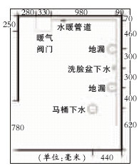 衛(wèi)生間很小,長邊2.1M,短邊僅1.5M,但主人需要在衛(wèi)生間設(shè)置諸多功能:蹲坑、淋浴、洗手盆、小洗衣機(jī)、墩布池等,而且,要求盡量不改動(dòng)下水位置。