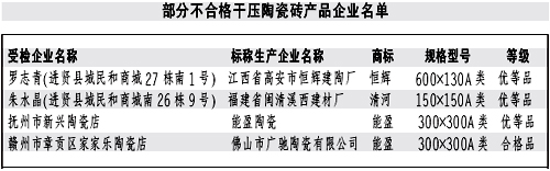 本報(bào)訊記者龔漢斌報(bào)道:近日,省質(zhì)監(jiān)局公布了近期對(duì)干壓陶瓷磚產(chǎn)品進(jìn)行省級(jí)產(chǎn)品質(zhì)量監(jiān)督抽查的結(jié)果。質(zhì)監(jiān)部門(mén)共抽查了51家生產(chǎn)企業(yè)生產(chǎn)的52批次產(chǎn)品,抽樣合格率90.4%。抽查結(jié)果表明,本次抽查的陶瓷磚其放射性核素限量指標(biāo)均達(dá)到了標(biāo)準(zhǔn)規(guī)定的要求;但仍有部分產(chǎn)品存在一些問(wèn)題。