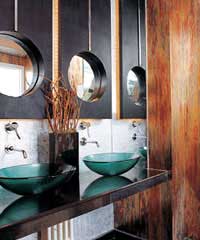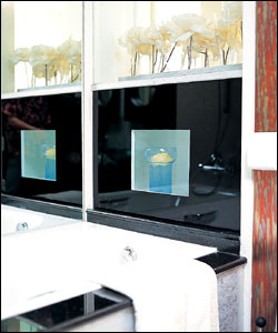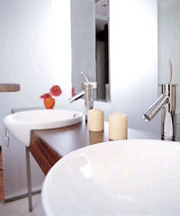 整體風(fēng)格:因?yàn)樾l(wèi)生間本身不大,所以這套衛(wèi)生間的墻面采用了高反光的玻璃材質(zhì),地面也用了高拋光的瓷磚,配合以明亮的燈光,衛(wèi)生間看起來大了不少。不銹鋼的面盆、龍頭、透明的淋浴間使整個(gè)衛(wèi)生間極富現(xiàn)代感。