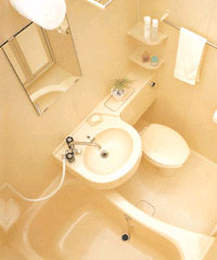 裝飾特點(diǎn):在極為窄小的空間里,可以實(shí)現(xiàn)最多功能。如果衛(wèi)生間很小,一般擺放浴缸是不可能的,但整體預(yù)制型衛(wèi)浴利用鑄模的優(yōu)勢解決了這個(gè)問題,浴缸在長度的限制下盡量做寬,盥洗池和馬桶為一個(gè)整體,這樣,水箱的位置可以做一個(gè)放置物品的臺(tái)面。