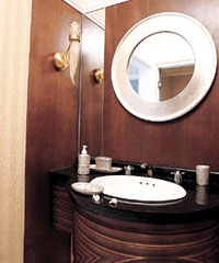 整體風(fēng)格:選用了中國傳統(tǒng)家具中多見的黑色為主色調(diào),整體效果沉穩(wěn)大氣。雙人面盆使用起來舒適而不擁堵。因?yàn)榭臻g較大,所以使用了浴缸,與主人的身份也很相符。整個(gè)設(shè)計(jì)中,墻面以豎線條為主,這樣使人感覺層高增加,擴(kuò)大了衛(wèi)生間縱向的空間感。