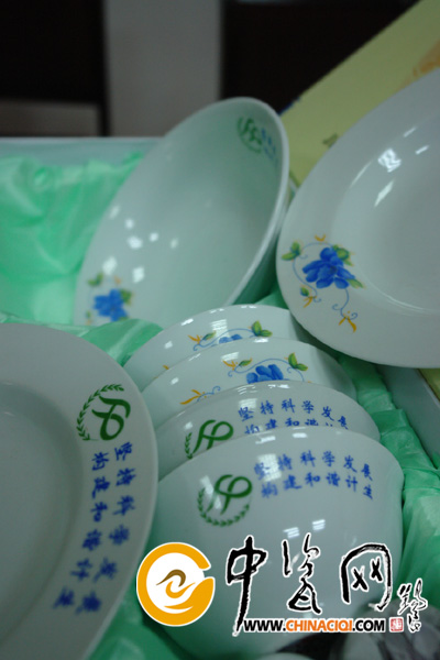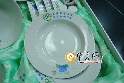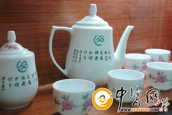 這批陶瓷包括茶具、餐具、筆洗等五個系列,共有16套。其中一套茶具以“水點(diǎn)桃花”為畫面,壺體印有“堅持科學(xué)發(fā)展構(gòu)建和諧計生”字樣。