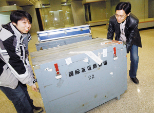 昨天下午1時許,在工作人員嚴密押送下,4個裝載著國禮珍品的密封箱運抵周鄧紀念館院內(nèi)。還未見珍品,那些專門為展品“量身定做”的箱子就讓人很感興趣,每個箱子都有1米多高,由于展品極其珍貴且是易碎品,在包裝時里面不僅加了防震的材料,箱子外面也特別注明易碎標志,每一件珍品都被固定在專門的錦盒中,且是根據(jù)它們的大小和形狀量身定做的。