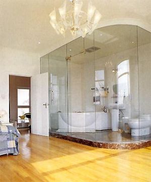 近幾年來,隨人們生活水平提高,人們更追求生活中的時尚、情趣與個性。時下歐洲 非常流行的衛(wèi)浴間、臥室一體化也走進中國,且深受年輕人和白領(lǐng)階級寵愛。這種浴室緊鄰主臥室,二者之間只用一塊磨砂甚至透明玻璃隔開,讓最為隱私的衛(wèi)生間變得透明開放化。但是如果臥室中的衛(wèi)生間是面向客廳或其他公共空間,最好不要選擇透明衛(wèi)浴。浴室中水汽繚繞,里面人影在珠簾下若隱若現(xiàn),這種神秘感正符合當(dāng)下年輕人追求解放的天性。