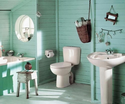 滿眼的湖綠色,如一泓春水,在陽光的照耀下熠熠生輝。乳白色的潔具、古樸自然的田園風(fēng)格浴室家具、一兩件藤木小物件,再?zèng)]有比這兒更閑適的地方了。