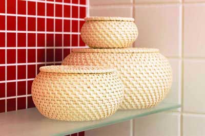 編織式收納罐,大有大的用途,小有小的道理;蛘呷繑[出來,勾勒幅“吉祥三寶”的景象,讓爸爸、媽媽和孩子都收納有道。而且罐蓋能有效避塵,還具私密性,避免了來客用衛(wèi)浴間的不方便。手工編制,民俗特色,與衛(wèi)浴間的現(xiàn)代風(fēng)格形成對(duì)比,是現(xiàn)今流行的混搭派。