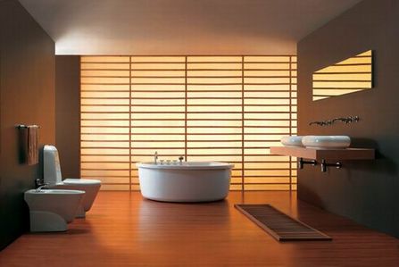 奢華空間 圓形的臺盆和浴缸給人以奢華的感覺,木質(zhì)的踏板和移門設計,給人以濃重的懷舊感。