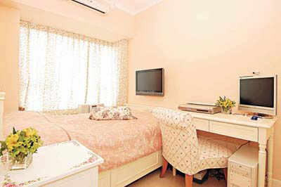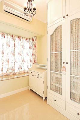 粉橙色布置可營造夢幻般的童話氣氛,教人頓時眼前一亮,營造“家”的感覺?、飯廳堂分界鮮明,墻身上半部配用粉橙色,甚為奪目,下半則以條紋式設計,為平實的墻身增添動感一面?蛷d擺放了鮮紅色布藝沙發(fā),與一室散發(fā)的田園風格甚為匹配。旁邊的落地玻璃配用半透視的碎花窗紗,可阻隔過量的日光內(nèi)進,又可為室內(nèi)空間添上鄉(xiāng)村風味。細心一看,原來電視組合柜亦見心思,印上不少拼花圖案,為簡潔的柜子帶來生氣,輕易地點綴一室的視覺效果。維多利亞風格飯廳布置精致,中央放了四人餐桌和碎花餐椅,為增添儲物量,已分別設計出同系列的飾柜及地柜,設計略帶維多利亞色彩,為單位塑造優(yōu)雅一面,亦營造了理想的進膳環(huán)境。主人房貫用同一色系的家具,加設特色睡床背板,糅合房內(nèi)各式碎花圖案,讓房間恍如精品式小寢室,并放下小植物,為居者帶來好心情。另一方面,是一入墻躺式衣柜,以半透玻璃作配,內(nèi)藏間隔甚多,足以容納不少衣物。另一個房間則改為書房,淡淡的綠色設計,感覺清新寫意,以深黑色吊燈作配。