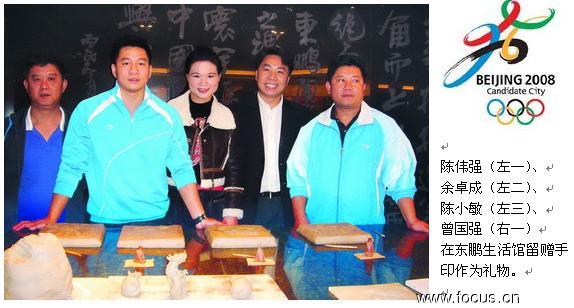 “奧運(yùn)城市行”活動(dòng)組走進(jìn)佛山。四位為廣東人民所熟悉與喜愛的奧運(yùn)冠軍:23屆奧運(yùn)會(huì)60公斤級(jí)挺舉冠軍陳偉強(qiáng)、悉尼奧運(yùn)會(huì)舉重冠軍陳小敏、23屆洛杉磯奧運(yùn)會(huì)52公斤級(jí)挺舉冠軍曾國(guó)強(qiáng)、1996年亞特蘭大奧運(yùn)會(huì)跳板冠軍余卓成等來(lái)到東鵬陶瓷生活體驗(yàn)館參觀。他們還應(yīng)邀在特別準(zhǔn)備的泥模上印出了自己的手紋,贈(zèng)送給東鵬陶瓷一份具有奧運(yùn)紀(jì)念價(jià)值的特殊禮物。