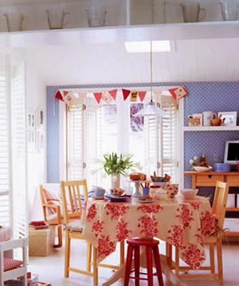 鮮明的白色、紅色和藍(lán)色將餐廳空間裝點(diǎn)得明凈、通透而又輕松寫意。新英格蘭風(fēng)格的百葉窗門、圓點(diǎn)花樣的藍(lán)色壁紙和精制的白、紅色織物, 讓人輕易便歡快輕松起來,那一排孩童的卡片更是讓家庭的溫暖瞬時(shí)散發(fā)出來,令人陶醉。