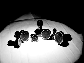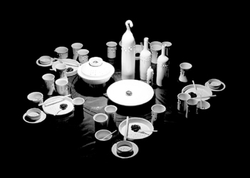 《宴席》作品分一、二兩件。第一件作品中安排了餐桌上常用的花瓶、酒瓶、筷子、勺子、叉子、小碟子、盤子、火鍋等。大量的器皿,都鑲嵌了與此有關的盲文單詞和黑玫瑰造型。作品使用的原料是高白釉、高白泥,做得白而透明,使其散發(fā)出一種蒼涼的氣息,給日常宴席無聊歡欣、虛假熱鬧的氣氛潑了一盆冰涼刺骨的雪水。因為人們明白:今天的宴會有時是不少曖昧的交易場所、利益的合約地和行為人喪失道德感的慶功地。
