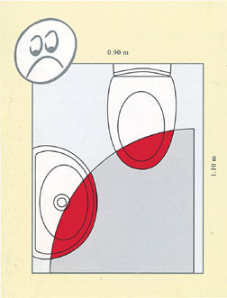 不足1平方米的浴室實在有夠小,想要“五臟”確有難度,但主要的必需設(shè)備總是要有的--洗面盆和坐便器,并且最好還要選擇異形產(chǎn)品,這樣才能保證它們能夠安裝在必須利用的角落處。規(guī)格較小的面盆也可以,但一定要搞清楚具體尺寸,細微的偏差就可能使之無法安裝。