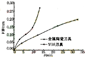 圖2 金屬陶瓷刀具和YG8刀具切削冷硬鑄鐵時的磨損曲線