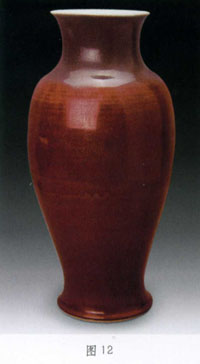 “冰裂紋”開片:這是形容在冰晶玉潔的釉面上形成了象冰雪一樣清徹的裂紋。這種裂紋十分致密,沒有縫隙,雜質無法侵入,歷經(jīng)數(shù)百年,仍然顯得晶瑩剔透。這是一件宋龍泉窯三足爐(圖11),冰裂紋清晰可見。這件清康熙年間燒制的觀音尊(圖12),器形典雅,猶如亭亭玉立的南海觀音。從上至下鮮艷如初凝的牛血般的釉色,顯得雍容華貴。清代詩人許齋有在《郎窯行·戲呈紫衡中承》詩中寫道:“邇來杰出推郎窯,郎窯本以中丞名,……比試成宣欲亂真,乾坤萬象歸陶甄,雨過天晴紅琢玉,貢之廊廟光鴻鈞。”郎窯紅是冰裂紋的典型代表。這種開片以縱向為主,橫向較少,與血絲般的牛毛紋內(nèi)外呼應,奇異非凡。