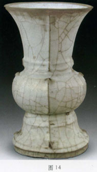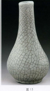 “文武”開片:這是形容陶瓷器物上下左右,通體開片。其中呈大型的不規(guī)則開片,比喻為“文片”,當中又套有較小型的開片,比喻為“武片”。這是一件宋哥窯膽式瓶(圖13)。自古以來就有“文武之道,一張一弛”的比喻,以此來形容這類開片的形式頗為恰當。這種開片以宋官窯、哥窯特征最為顯著(圖14),也是這類瓷器除紫口鐵足之外最大的特征,后世明代成化、清代雍正、乾隆年間仿哥窯制品多仿之(圖15、16、17)。