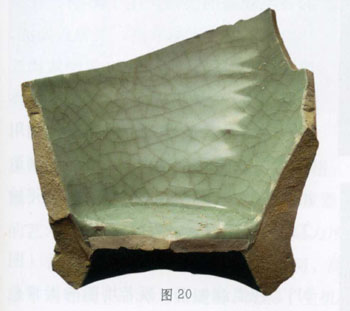 “魚鱗”狀開片:這是一種十分獨特的開片現(xiàn)象,主要集中在北宋汝窯、宋官窯和少數(shù)南宋龍泉窯制品上,其他品種未曾見過。形態(tài)是在肥厚釉層的層與層之間產(chǎn)生的層間開片現(xiàn)象。這是故宮藏北宋汝窯三足奩(圖18)和北宋汝窯敞口洗(圖19)。讀者可以從圖片上清晰地看出這種層間層層疊疊、晶瑩閃亮、猶如魚鱗狀一般的開片。原因是這類瓷器釉層很厚,有些甚至超過了胎體厚度(圖20)。如此厚的釉層是多次 上釉形成的,每次上釉都要等干燥后再施,故各層釉之間薄厚不均,瓷器燒成后,層間應力不同,在層間產(chǎn)生斷裂。目前河南汝窯研究所已掌握了這類工藝,不過仿品開片過于密集,顯得刻意做作,不如真品那般酣暢自然。