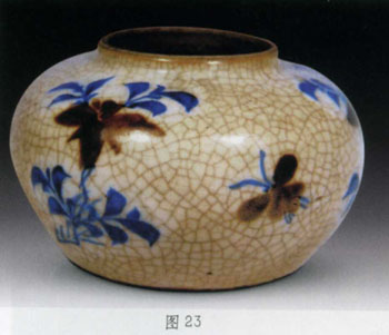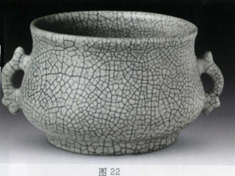 “百圾碎”開片:這也是哥窯開片的一種(圖22),只不過是紋片更細碎而已,是出窯前降溫過快,致使釉面四分五裂,裂紋密如攢珠。晚明天啟年間的“煨瓷”(圖23)釉面上被稱作“魚子紋”的開片也是這種效應,不過是名稱叫法不同!讹嬃鼾S說瓷》中提到“器小開大片,器大而小片皆足貴也。晚近以來則不貴哥窯之開片,而貴郎窯之開片。大抵開片瓷器,概以捫之無痕者乃為可貴也。”這是自古以來人們鑒賞的標準。