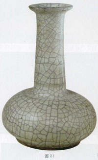 “金絲鐵線”型開片:《簡明陶瓷辭典》解釋為“紋片的一種,傳世哥窯瓷器的特殊紋飾,因開片有大、小之分,大開片呈深灰似鐵,小開片呈醬褐色,似金絲而得名”(圖21)。這種釋義僅將開片的特征表述出來。這種開片屬于人工二次開片,這在古陶瓷品系中是絕無僅有的。古代工匠利用哥窯出窯前驟然冷卻的方法,釉面內(nèi)應力急劇釋放產(chǎn)生大的開片。然后將瓷器浸泡入含鐵的溶液中,裂紋將鐵物質吸附進裂紋內(nèi)形成“鐵線”效應。再將這種一次開片的瓷器放入窯爐內(nèi)烘烤,不等釉面熔化,再進行第二次驟冷,使釉面再次在大開片中產(chǎn)生小開片,再將燒成的瓷器放入陳腐的茶葉水中,裂紋再將茶堿之類的色素吸附進縫隙中,就形成了大片套小片,鐵線裹金絲的藝術效果。這種哥窯特有的工藝是自宋以來古代工匠人為掌控開片的典型例證,并被元、明、清繼承與延續(xù)至今。當代仿品中也使用了這種工藝,但遠未達到真品的古拙之氣。