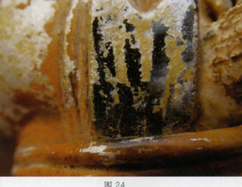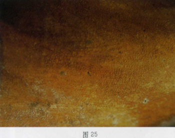 “蒼蠅翅”開片:這是唐三彩特有的現(xiàn)象(圖24)。唐三彩是唐代盛行厚葬之風的產(chǎn)物,并吸收西域風情,塑造出了器型豐富、絢麗多姿的器物,充分昭示了盛唐文化,受到世界各國的青睞。唐三彩屬于陶質胎體,胎釉結合度不好,在千百年地下埋藏中,受到水氣的侵蝕,器物裂析成蒼蠅翅膀大小的細碎透明開片,四周微微翹起,如同干涸的池塘泥土四周翹起一般,屬于歷史性自然開片范疇,至今造假者無法仿制。這也是鑒別唐三彩真假的要領之一。