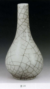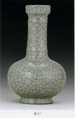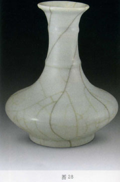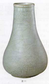 這件北宋年間官窯大口瓶(圖31),在溫潤如玉、凝若堆脂的天青色釉面上,布滿了縱橫交錯,或大或小,或長或短,或連或斷的紋路,使人產(chǎn)生遐想。古陶瓷是靜物,尤其是陳設器物,陳設在室內(nèi),給人以寧靜、肅穆的感覺。那條條紋路、塊塊紋片縱橫交錯,忽斷忽連,目光沿著紋線追尋而產(chǎn)生浮想聯(lián)翩,產(chǎn)生了躍動迷離之感。賦予了靜置器物之生機,賦予了古陶瓷千年不朽、長青不衰的藝術生命力,這就是開片藝術的魅力所在。