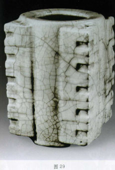 不知藏家是否注意到一種有趣的規(guī)律性現(xiàn)象,不論是何種瓷器,不論是哪個朝代的瓷器,也不論是圓器或琢器,只要是用轆轤一次性拉坯成型的器物,其開片主要紋路的延伸方向均是從器物的底部自下而上,從左向右延伸傾斜。產(chǎn)生這種現(xiàn)象是因為拉坯時操作轆轤的旋轉方向是自右向左轉,也就是順時針方向,這種旋轉的胎體內(nèi)部并不十分均勻,產(chǎn)生了一種自下而上,自左向右的密度差,內(nèi)應力的方向差異正是這個方向。故施釉燒成后,其釉層開片方向正好與拉坯方向相一致。這就進一步證明了胎釉之間開片方向是與其內(nèi)應力的拉伸方向保持相同,順著拉坯方向從下到上、從左向右延伸(圖26、27、28),當然這種規(guī)律不包括那些異型器物,用貼塑方法,或捏塑等其他方式成型的,就沒有這種現(xiàn)象(圖29、30)。
