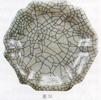 這件南宋哥窯花口洗上的金絲鐵線( 圖32),何其典型,何其明顯。藏家欣賞它時一定會琢磨如何產(chǎn)生的這種藝術效果,古人是如何在堅硬的瓷面上穿針走線,勾勒出變幻莫測的各式紋片。