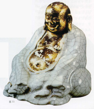 故宮博物院珍藏的清雍正仿哥窯彌勒佛鎏金像(圖33)?梢钥闯龉糯そ橙绾螊故斓卣莆樟碎_片藝術,將慈眉善目、笑口常開、憨態(tài)可掬的佛祖,塑造得惟妙惟肖,充分表達了彌勒佛“容天下難容之事,笑天下可笑之人”的雍容大度,普渡眾生的寬宏海量。佛像的僧衣袈裟恰到好處地開片成佛家長老身披的“百衲衣”。而佛陀的面部及裸露部分卻未見任何開片。這就是開片藝術出神入化之處。