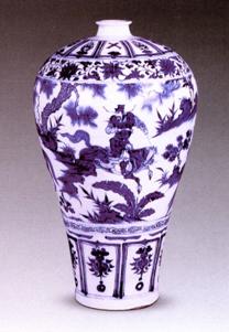 明代前就已設(shè)立御窯廠(chǎng),洪武二年政府就規(guī)定“祭器皆用瓷”。在對(duì)外入貢國(guó)的答贈(zèng)中,也需要大量瓷器,洪武七年就一次性賜贈(zèng)琉球瓷器七萬(wàn)件?梢(jiàn)當(dāng)時(shí)的瓷器生產(chǎn)量如此之大。洪武時(shí)期,青花色調(diào)略發(fā)灰,呈淡青色,主要是用的國(guó)產(chǎn)青花釉料,部分是元代留下的進(jìn)口青花釉料。1964年南京故宮出土的瓷器中,有一部分是洪武時(shí)期的制品。其中有一件官窯青花云龍紋盤(pán),外壁繪青花云龍,里壁模印,盤(pán)心畫(huà)如意云三朵?傊,明青花瓷比元青花更有發(fā)展,在產(chǎn)量和質(zhì)量方面都突破元代。永樂(lè)、宣德時(shí)期經(jīng)過(guò)三十多年的發(fā)展,青花瓷已達(dá)到又一高,這一時(shí)期的青花瓷,胎骨堅(jiān)、釉精細(xì)、青花濃 艷、造型多樣和花紋優(yōu)美而負(fù)盛名,被世人稱(chēng)我國(guó)青花瓷器的黃金時(shí)代。永、宣時(shí)期采用的青花料有三種:一是進(jìn)口釉料,色澤鮮艷,帶有黑色鐵銹斑點(diǎn),產(chǎn)地來(lái)自南洋的“蘇泥勃青”,據(jù)說(shuō)是由鄭和出洋帶回來(lái)的鈷土礦,含氧化鐵較多。二是國(guó)產(chǎn)料,青花較深為藍(lán)色,比較柔和,多用于民窯產(chǎn)品。三是進(jìn)口料和國(guó)產(chǎn)料混合使用,各取所長(zhǎng),進(jìn)口料容易暈散、流淌,多用于寫(xiě)意畫(huà)面,比如繪畫(huà)庭院嬰戲,畫(huà)庭院用進(jìn)口青花料、畫(huà)人物用國(guó)產(chǎn)青花料,這樣巧妙結(jié)合層次分明,藝術(shù)效果較好。這個(gè)時(shí)期青花瓷器的鐵銹斑,永樂(lè)時(shí)期出現(xiàn)多,宣德時(shí)期比較少。永、宣時(shí)期的青花大盤(pán)較多,繪畫(huà)內(nèi)容常見(jiàn)的有纏枝花卉、一束蓮、多為砂底,有小點(diǎn)火石紅斑。這時(shí)期也生產(chǎn)一些其它器如永樂(lè)年制造壓手杯,中心畫(huà)雙獅滾球,還有玉壺春瓶、梅瓶、貫耳瓶、高足碗、蓋碗等青花器。