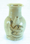 的彩釉雖有削落之處,但這非但沒有損害其整體形象,相反增加了器物厚重的滄桑感,使人一看便能認定這是開門的長沙窯。長沙窯釉下壺類產(chǎn)品,其紋飾都在流的正下方,該壺紋飾以褐彩勾線,綠彩暈染,其奮飛的鴻雁及其一抹青山,雖極簡練,卻引人入勝,浮想聯(lián)翩。你看那剛健壯碩的大雁,引頸昂首,喙部與壺頸相接,雁首直指天穹,雙翅舒展,作飛行鼓動狀,仿佛使人聽到它搏擊空氣的呼呼風聲,雁翎以褐彩勾勒,根根硬朗明快,齊刷刷的向后,更增加了迎風前進的動態(tài)感。在雁紋的下方接近壺身底腳處,畫師匠心獨運,巧妙地繪有兩座青綠山峰,著筆不多,卻意境深遠。