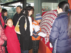 春節(jié)期間,中國陶瓷館推出了以“圓夢(mèng)陶瓷殿堂,探源千古文明”為主題的賀歲陶瓷文化展,初一、初二免費(fèi)開放。此舉得到淄博市民的熱烈響應(yīng),許多外地人也來淄觀看展覽,他們?yōu)樘沾绅^豐富的館藏驚嘆不已,陶瓷館內(nèi)刻瓷藝術(shù)大師的現(xiàn)場表演更是讓人目不暇接,兩天共有2000多人參觀了展覽。這是市民在參觀陶瓷京劇臉譜展覽。
