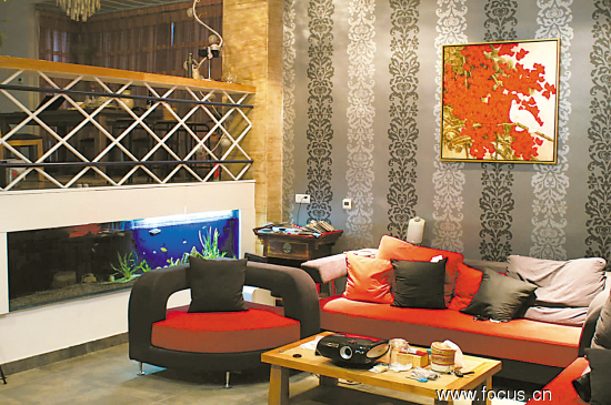 錯(cuò)層的客廳,吧臺(tái)下面的小半面墻上鑲了個(gè)大魚(yú)缸