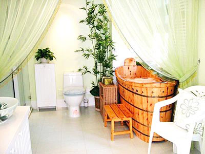 淺綠色的簾幕背景、綠色的植物的點綴、傳統(tǒng)的木質(zhì)浴盆使整個空間充滿了回歸自然的韻味