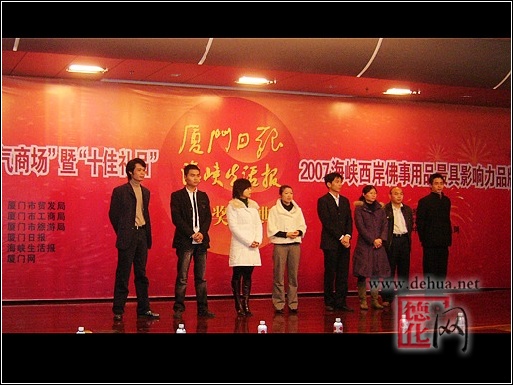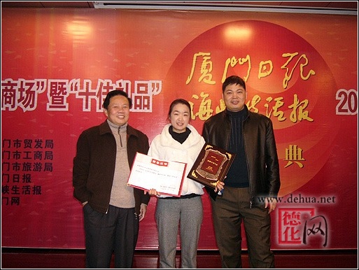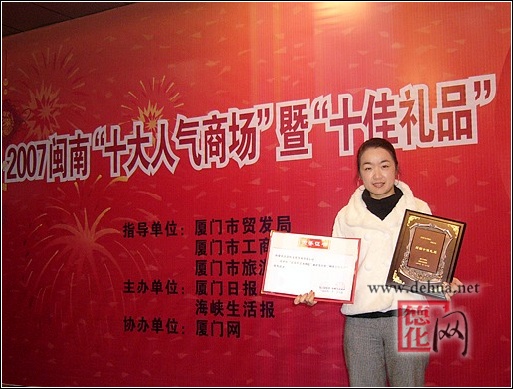 1月28日下午,廈門日報(bào)、海峽生活報(bào)聯(lián)合在報(bào)業(yè)大廈多功能廳舉行頒獎盛典。2007“閩南十大人氣商場”、“閩南十佳禮品”分別揭榜。品牌茶葉、漆線雕、藝術(shù)陶瓷、高粱酒等“十佳禮品”還在頒獎現(xiàn)場紛紛亮相。
