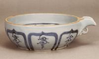 說 明: 口內(nèi)斂,淺腹微鼓,無釉平底。內(nèi)外繪青花,色澤灰黑。