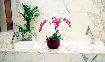 “水落石出”有乾坤如果不是有個水龍頭,乍看上去,記者還真不知道原來這是洗手盆!洗手盆的表面幾乎是平的,洗手盆中間放著一盆花,上面有兩個水龍頭,除此之外,別無他物。記者仔細(xì)觀察后發(fā)現(xiàn)看似平整的表面有那么一丁點兒向中間傾斜,水流流到中間的花盆便“消失”了。