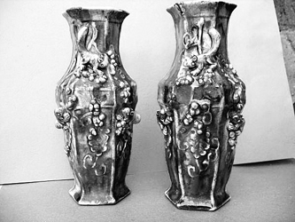 第二件亮相的是花釉六角堆塑松鼠葡萄紋對瓶,瓶高20cm,唇口、口沿邊長6cm,底足邊長4cm。對瓶釉色豐富別致,以紅釉為基調(diào),雜有少量黃、紫、綠、白等多種色彩交融流淌,自然成紋。瓶腹外壁有捏塑三只跳躍在葡萄叢中的松鼠。兩只瓶上的紋飾相似,但松鼠躍動的方向相背。此時瓶制作工藝精細(xì)復(fù)雜,瓶身因為不是圓器,所以不能在轉(zhuǎn)盤上拉坯一次成型,而要制作十九塊坯片,瓷工在坯片半濕半干狀態(tài)拼接組合成瓶身,難度極高。再看松鼠葡萄,采用古老的捏塑堆貼工藝。瓷工用與瓶身質(zhì)地相同的瓷土捏塑成松鼠與葡萄紋飾,再粘貼到瓶坯上。捏塑堆貼工藝在河姆渡文化陶器上已經(jīng)應(yīng)用,西晉青瓷谷倉上樓闕、人物、鳥獸等更顯成熟。對瓶所施“花釉”,更令藏友贊嘆不已。據(jù)陶瓷專家研究,瓷釉中由兩種或兩種以上的不同著色劑,在一定溫度下任其自然融合流淌形成的紋飾謂之為“花釉”!赌细G筆記》上有一段記載,對花釉工藝作了最佳的描述:用白釉為底,外加釉里紅,元子(浙料青花之一種)少許,涂于胎外,入火高溫使其流淌,顏色變化任其自然,并非有意預(yù)定為某一種色澤……從制作工藝以及紋飾繁縟風(fēng)格判斷,對瓶應(yīng)為清中期民窯產(chǎn)品。至于產(chǎn)地,有藏友因其胎體較厚,認(rèn)為出自北方窯口。但也有藏友異議,認(rèn)為六角瓶體拼接成型,所以胎體不可能像圓器那樣輕薄,未必不是南方窯口——各抒己見,暢所欲言,求同存異。