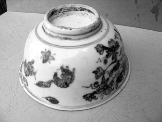 主人捧出青花瓷碗,器型敦厚豐滿,一眼便知明瓷風(fēng)格。細(xì)看胎質(zhì)潔白細(xì)膩,施釉均勻,釉層透明,白中泛青。唇口、碗口直徑15cm,足徑6.5cm,高7.2cm。沿口內(nèi)外均繪有雙線弧紋一道,器脛和圈足外壁有雙線弧紋,足根繪單線弧紋。足底較平整,施釉,不見乳釘,挖足細(xì),足壁薄,圈足內(nèi)壁與地面垂直。碗底內(nèi)心有雙線圓弧,中央繪秋葵。碗腹內(nèi)壁繪有兩組圖形相似位置相向的紋飾。一組為枝繁葉茂、藤蔓綿延中垂地的小香瓜,謂之為“瓜瓞綿綿”!对·大雅》有言:“綿綿之種,大者曰瓜,小者曰瓞”,寓豐收甜蜜、子孫繁衍吉祥之意。另一組為“雙鼠戲瓞”,松鼠直翹的牙須與蓬松的尾巴畫得很夸張,那機(jī)警、靈動之神韻呼之欲出。瓜瓞圖畫面豐滿,戲鼠圖留白較多,兩組紋飾疏密相間,整體構(gòu)圖疏朗有致。紋飾采用勾勒點染和單線平涂相結(jié)合的畫法,先用深色勾勒輪廓,再用稍淡的青料渲染。青料為國產(chǎn)平等青,淡雅清麗,色階只有濃淡兩種,但巧妙搭配,變化萬千。據(jù)專家考證,松鼠紋飾在瓷器上出現(xiàn)不早于明代。此碗工藝、器型、紋飾等透露的信息,藏友一致斷定它是明代成化早期民窯青花瓷中的上品。主人說,此碗于數(shù)年前舊城改造建筑工地民工處征得。
