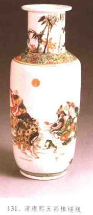 瓶式之—,因似舊時洗衣用的木棒槌而得名。多為清康熙民窯所燒。棒錘瓶又分圓、方、軟。圓棒槌又稱硬棒槌,造型為盤口,直頸較短,圓折肩,筒形長腹,底部多為平切式二層臺。器形大小不一,大者高達70厘米,小的不足10厘米。方棒槌瓶又稱方瓶、器形為撇口、短頸,平肩微折,方形長腹,腹部略為上寬下窄,方形寬足,凹底施釉。軟棒槌瓶特指雍正初期所燒制的一種器形,是與硬棒槌相對而言,造型不及后者挺拔。器口外侈,束頸,溜肩,直筒形腹,腹下略收。清光緒及民國時期對方棒槌瓶仿造較多。然仿品胎體比較厚重,口邊較薄且不規(guī)整。(見圖131)