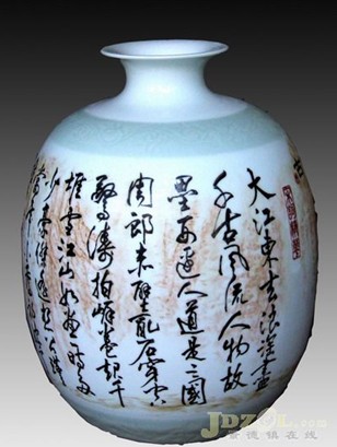 2004年,景德鎮(zhèn)千年大慶。詹明榮在為一本《千年瓷韻》的畫冊代擬《序言》時,情動由衷地寫下了這樣一段文字:“那一天,宋真宗走下金碧輝煌的大殿,輕撫著昌南鎮(zhèn)選送來的瓷瓶,贊不絕口,于是一道圣旨:昌南瓷標記“景德年制”。公元1004年開始,中國第一個用皇帝年號冠名的地區(qū)與品牌誕生了。”他也因此萌發(fā)將文字變?yōu)榛ó嬅娴膭?chuàng)作欲望。他搜集大量創(chuàng)作素材,反復設計人物造型,每個動態(tài)每個手勢都進行寫生,線描稿的每根線條都反復進行了推敲。白天上班,晚上作畫,在簡陋的畫室里整整一個酷暑,一幅鮮明地詮釋形象生動地表現(xiàn)了景德鎮(zhèn)千年華誕主題的大型歷史人物畫瓷板問世了!毒暗麓身崱芬鹆撕韧饷襟w的關注。中央電視臺國際頻道,中國文化報以及臺灣《陶藝》雜志都作了專題報道。