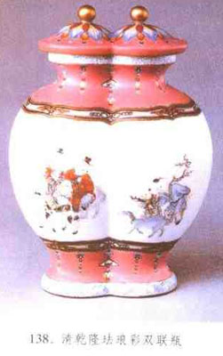 瓶式之一,流行于清代,因兩瓶聯(lián)成一體而得名。通常是兩瓶的腹部粘連在一起或自口至底通體相連。市場(chǎng)上出現(xiàn)的仿制品中,有書(shū)“大明萬(wàn)歷年制”楷書(shū)款的。(見(jiàn)圖138)
