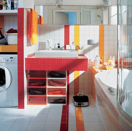 合與隱藏方式真的是令人樂此不疲,即使是浴室也有可以施展的空間。與淋浴房結合在一起的組合浴缸,利用有限的空間滿足了兩種不同的洗浴要求,說經濟實惠一點也不過分。洗面盆臺面下的空間安置了帶透明門的收納柜子,里面的物品一目了然,卻不礙觀瞻。一道普通的半隔斷分離出一個獨立的洗衣間,一道軟百葉簾又將這個洗衣間巧妙地隱藏起來。整齊有序的空間著實令人羨慕,其實只要你愿意,在自己的家里也不是不能實現。