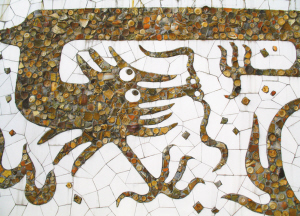 梅文鼎大師用采自貝丘遺址、奇石古窯址和南風(fēng)古灶窯址的陶片砌成的壁畫(huà)《瑞龍獻(xiàn)寶》。本報(bào)記者 周春 攝