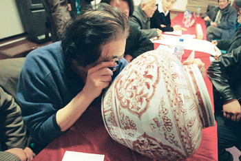 官窯瓷盤的出現(xiàn)讓現(xiàn)場(chǎng)掀起了一個(gè)小小高潮。上午11時(shí)30分,在多名保安人員的護(hù)衛(wèi)下,一件大連收藏者的巨大古瓷瓶出現(xiàn)在會(huì)場(chǎng)主席臺(tái)上。這件瓷瓶出現(xiàn)后,6位主持鑒寶的專家立即圍攏上來(lái),這件瓷瓶成了會(huì)場(chǎng)的焦點(diǎn)。