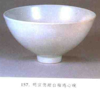 碗式之一,流行于明永樂、宣德時期。敞口、深腹,內(nèi)底下凹,外底凸出似雞心狀,小圈足。有大、中、小之分。釉彩品種多為白釉、青花兩種。清代雍正、乾隆時多有仿制。(見圖157)