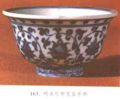 明代永樂朝景德鎮(zhèn)御窯廠創(chuàng)制、為皇室內(nèi)廷所壟斷的—種杯式。器呈撇口、弧腹、圈足,足底外沿凸出一條棱線。手持時(shí)器口恰合于拇指指節(jié),并因器壁自口沿而下胎體漸厚,托于手心有凝重之感,故名。明人谷應(yīng)泰《博物要覽》記載:“壓手杯,坦口折腰、沙足滑底。中心畫雙獅滾球,球內(nèi)篆大明永樂年制六字,或四字,細(xì)若粒米,此為上品,鴛鴦心者次之、花心者又其次也,杯外青花深翠,式樣精妙、傳世已久,價(jià)亦甚高。”壓手杯因彌足珍貴,后世仿品甚多,傳世真品寥寥,多為四字款識。(見圖163)