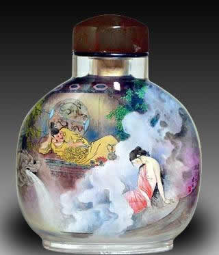 康熙時(shí)首先燒制的鼻煙壺是以鈷為著色劑的釉下彩--青花品種。色彩明快,圖案紋飾有龍鳳、八駿圖、寒江獨(dú)釣等。布局嚴(yán)謹(jǐn)規(guī)范,畫工精細(xì),繪制風(fēng)格與當(dāng)時(shí)畫壇藝術(shù)相通,造型多為古樸的爆竹筒式?钭R多為"康熙年制"雙排四字款,不加雙圈,筆意渾成,頗具韻味。這一時(shí)期的釉里紅與紅釉器色彩鮮紅艷麗,瓷質(zhì)細(xì)膩,造型規(guī)矩,也可稱為上品。