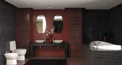 中國紅與黑色的瓷磚裝點(diǎn)著整個(gè)空間,浴室柜所在背景墻為紅色,而兩側(cè)潔具與浴缸的背景墻則為黑色,兩者相互呼應(yīng),相互補(bǔ)充。紅黑相間的回字紋拼圖磚作為兩種顏色中間的過渡,使之渾然一體。設(shè)計(jì)師通過色彩的組合搭配,有效的將浴室的功能區(qū)域劃分。