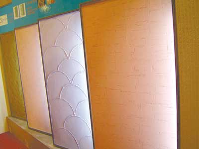 展位負責人介紹說,硅藻土具有細膩、松散、質輕、多孔、吸水和滲透性強的特性,以硅藻土為原材料生產出來的建筑材料,不僅具有不燃燒、除濕、除異味及通透性好的特點,而且還能夠凈化空氣、調濕、隔音、保溫、隔熱等。硅藻土的本色有白色、灰白色、灰色或淺灰褐色等,為保證環(huán)保性和穩(wěn)定性,這種添加不會氧化變色的礦物顏料制成的墻面材料均為淡色系。直接涂刮在墻面約2.5毫米左右,墻面可以做成平面效果、含稻草的粗面墻及劃痕、堆印等各類立體花紋。